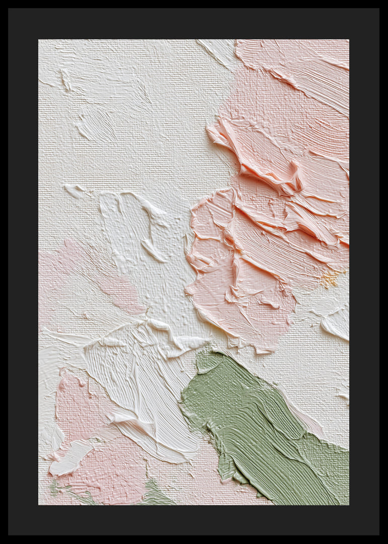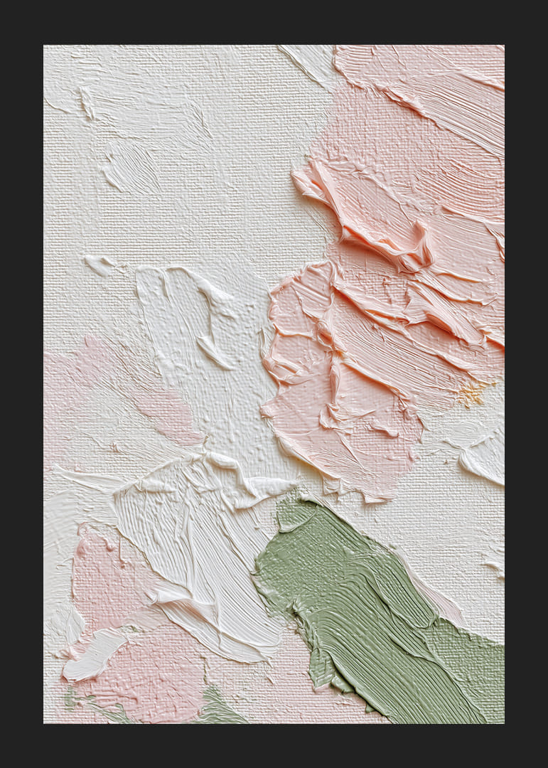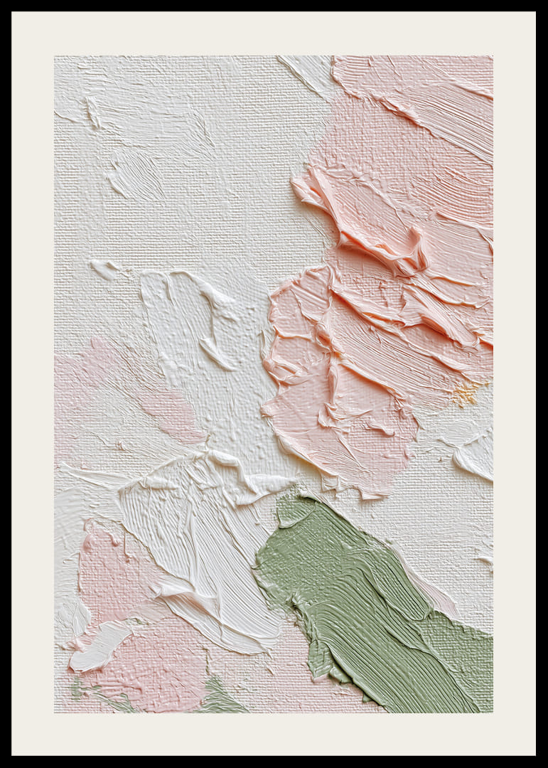 See poster püüab pilku oma pehmete pastelsete roosade, roheliste ja valgete toonidega, mis lõuendil õrnalt levivad. Tundub, nagu värvid sosistaksid omavahel, luues rahu ja vaikuse tunde. Õrn tekstuur ja peened värvitoonid tähendavad, et see poster mitte ainult ei kaunista seinu, vaid aitab muuta ruumi ka lõõgastavamaks ja esteetiliselt meeldivamaks.