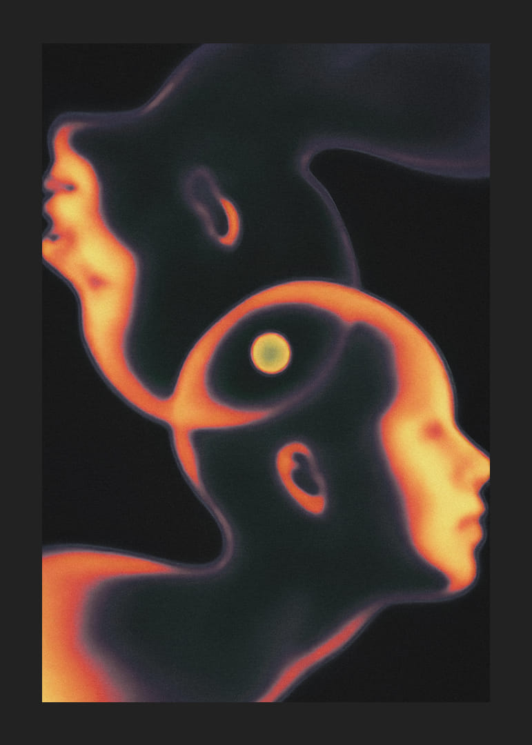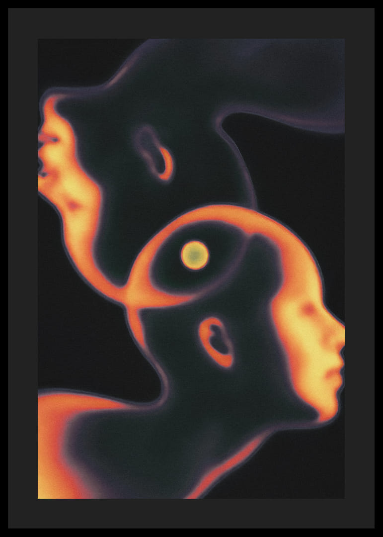 See plakat jäädvustab kaks helendavat siluetti sügaval ja salapärasel taustal, luues sürreaalse kogemuse. Tuliste värvide ja pimeduse kontrastid loovad lõpmatuse ja sügavuse tunde. Siluettide põimumine sümboliseerib ebamaist ühendust, mis näib ületavat aja ja ruumi. Sellest plakatist saab keskne vestlusteema ja kunstiline kaunistus igas moodsas kodus.