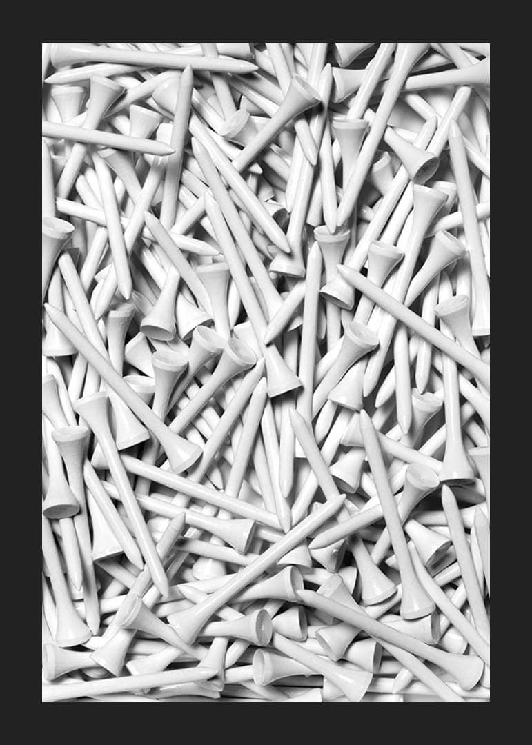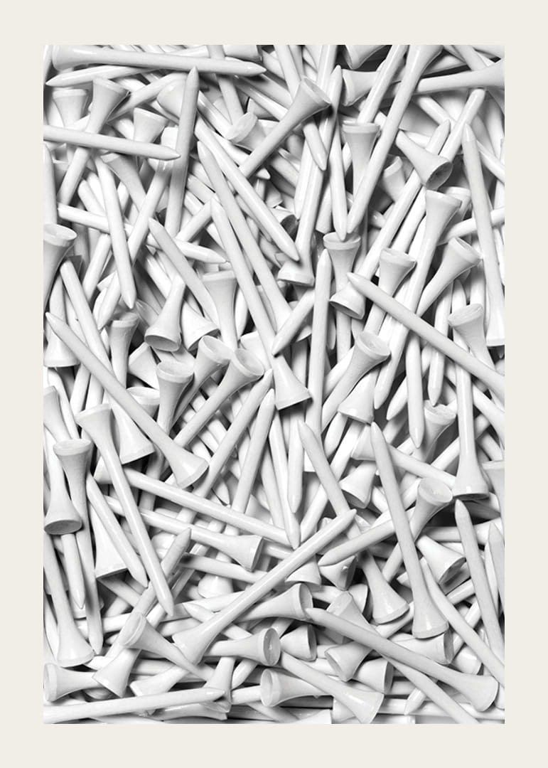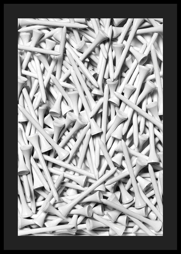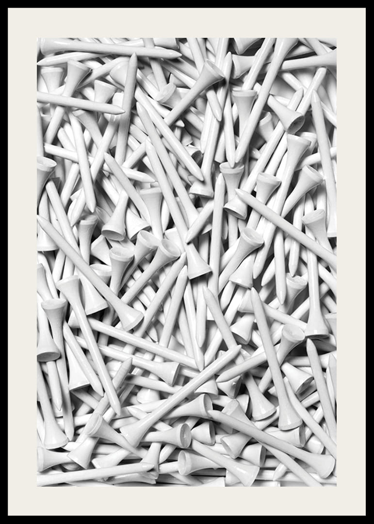 Lähivõte paljudest tihedalt mustrisse asetatud valgetest golfipulkadest. Mustvalged toonid rõhutavad graafilist muljet ja annavad motiivile moodsa ja sportliku ilme. See plakat sobib nii kodu spordinurka kui ka kontorisse neile, kellele meeldivad stiilsed sportlikud detailid.