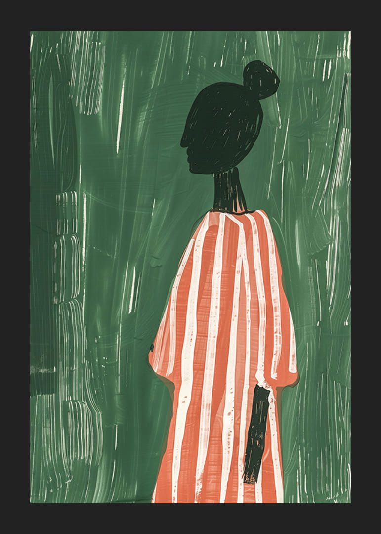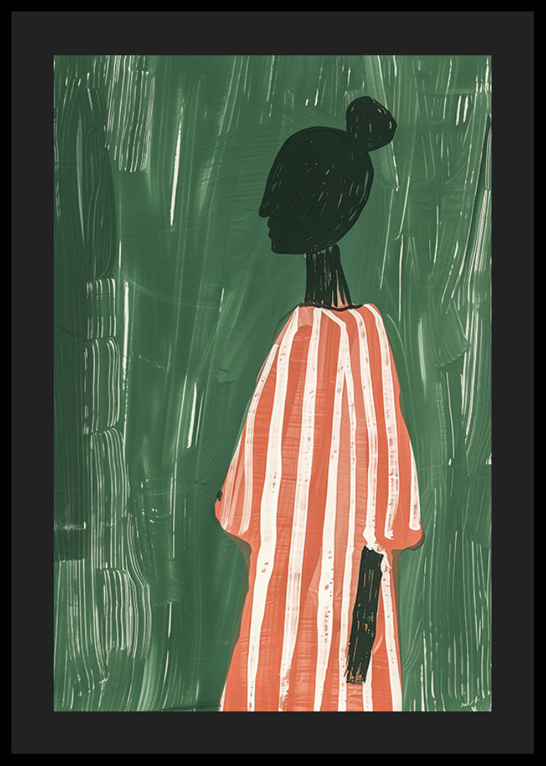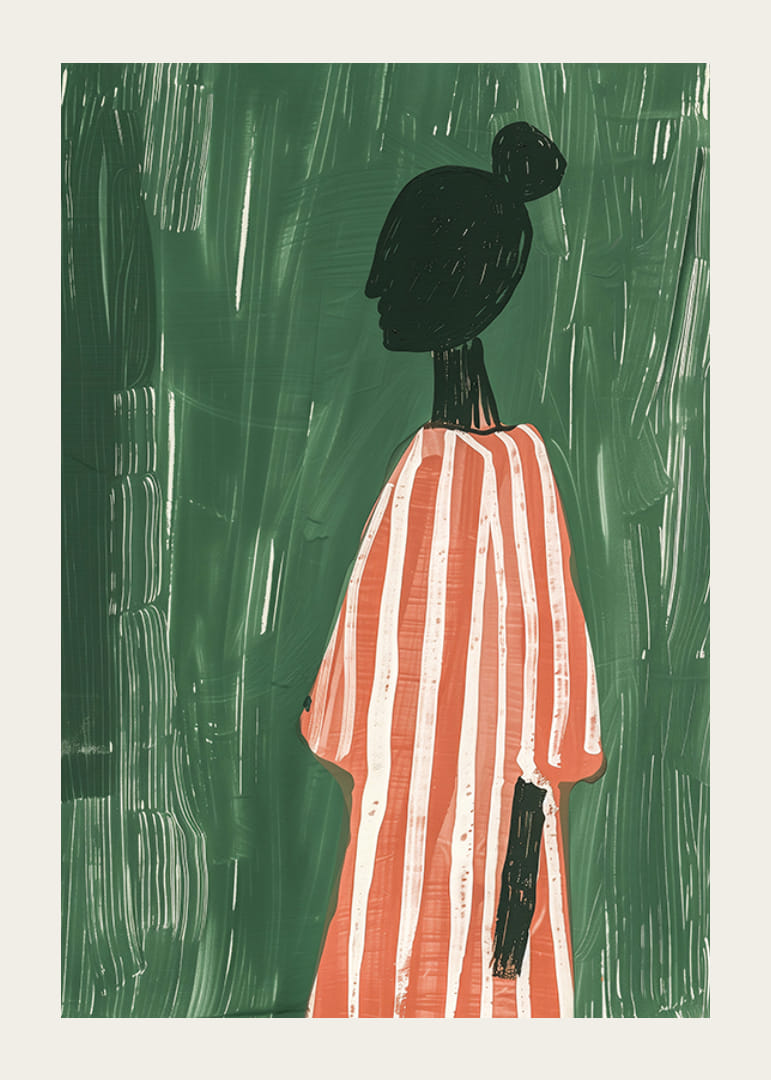 See minimalistlik plakat kujutab stiliseeritud siluetti ülestõmmatud juustega inimesest, kes kannab sügavrohelise tausta taustal avarat punase-valgetriibulist kleiti. Lihtsad kujundid ja kontrastsed värvid loovad harmoonilise ja kaasaegse tunde.